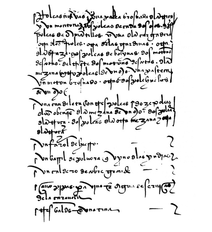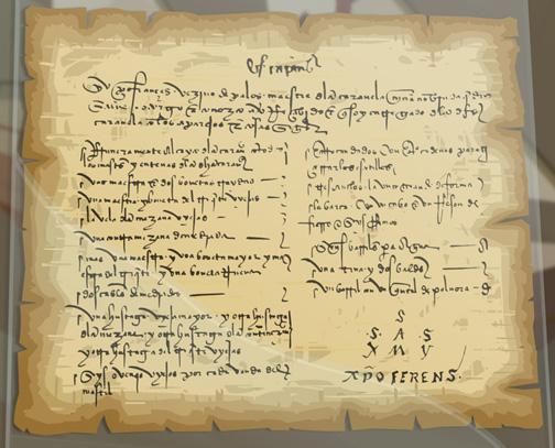 The supply list in Lost Treasure Hunt is based on caravel lists from the time of Columbus including one still existing today for the Niña. A sample of the text can be seen to the right of this paragraph. Compare the text of the fictional supply list in Lost Treasure Hunt, with the real writing.